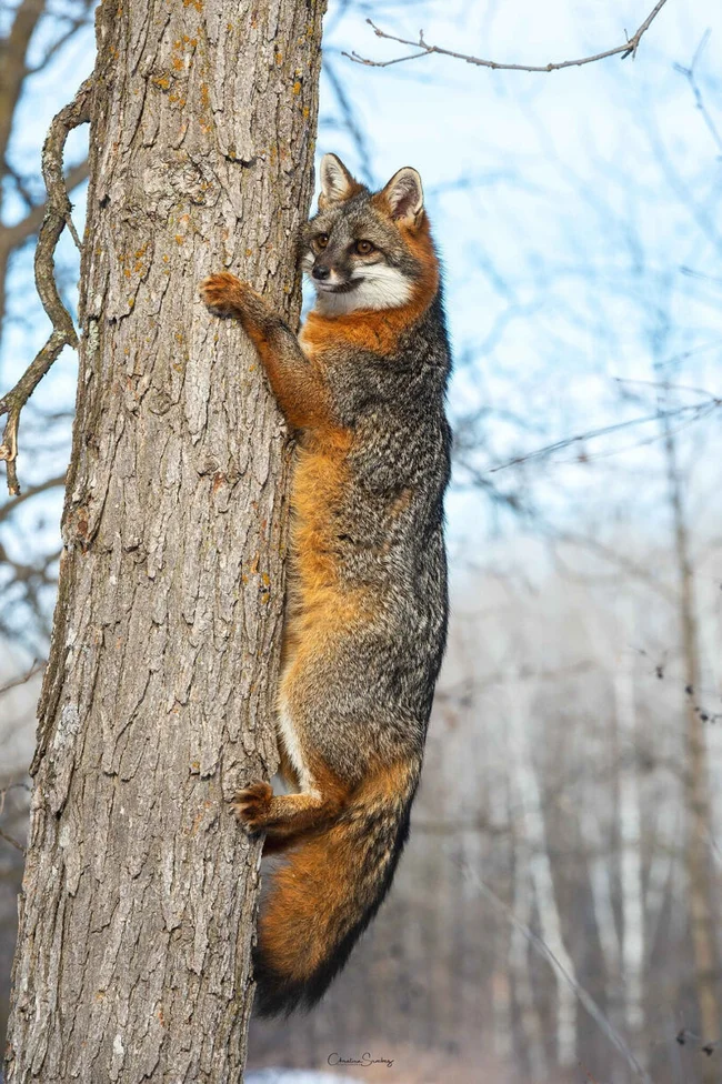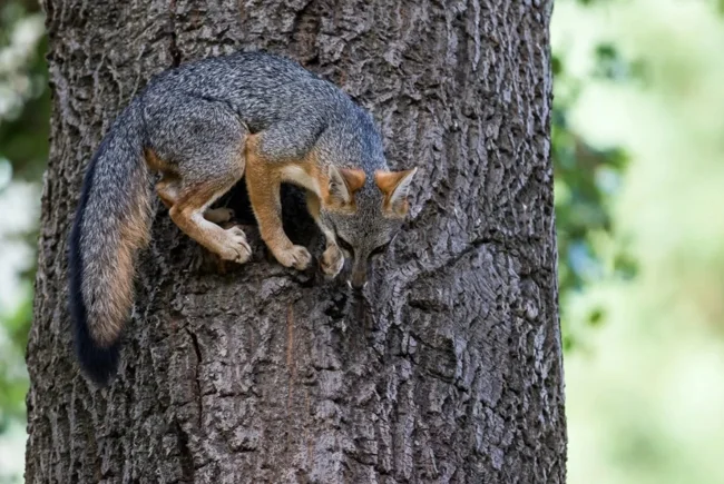 Зато для серой лисы, проживающей в Северной Америке, это уже полноценная половина быта! Острые когти, как альпинистские крюки, помогают взбираться на деревья, как котикам. Это спасает маленькую лису от больших проблем в морде лица койотов, рыжих лисиц и волков.
