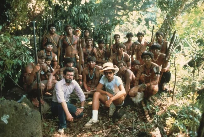 7. Стивен Спилберг и Джордж Лукас позируют вместе с массовкой "Охотников за затерянным ковчегом"
