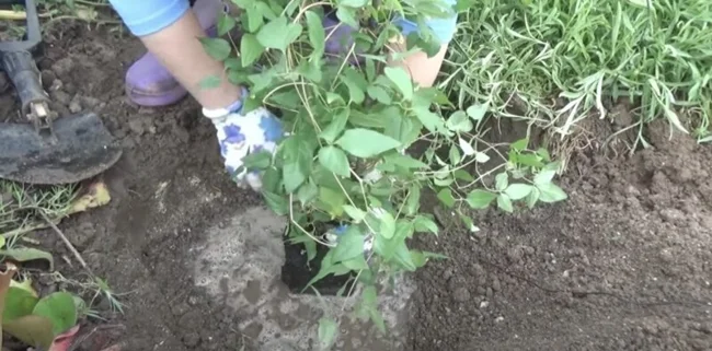 Аккуратно достаньте клематис из горшка и поместите его по центру посадочной ямы.