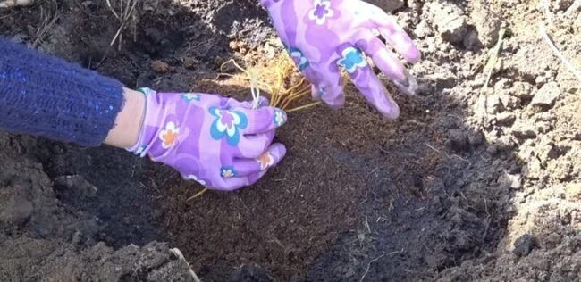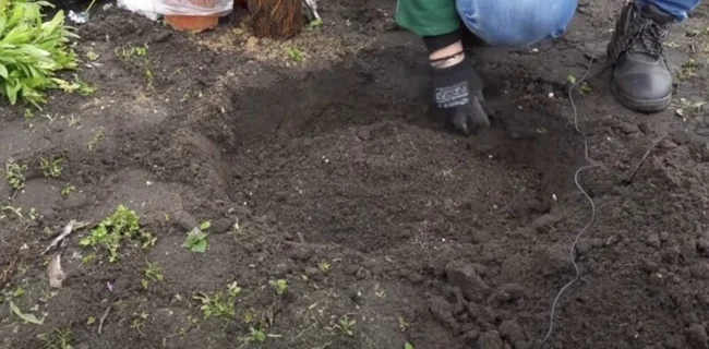 Выкопайте яму глубиной и диаметром в 60 см. На дно лунки высыпьте 10 л песка, 10 л компоста или перепревшего навоза, 10 л торфа, 100 г суперфосфата, по 200 г костной и доломитовой муки. Также добавьте 200 г любого комплексного гранулированного удобрения для выращивания цветов. Тщательно перемешайте все компоненты лопатой или вилами.