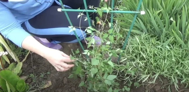 Если у клематиса уже достаточно длинные стебли, аккуратно распределите их по опоре.