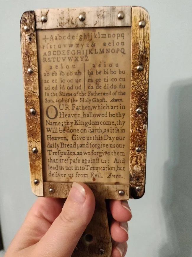 Детская книга на деревянной ножке была изготовлена в 12 веке. Её содержание — это азбука и короткие тексты для чтения детьми. Ронять такую книгу можно было сколь угодно часто — тонкий роговой слой защищал её от любых повреждений.