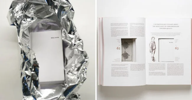 Для того, чтобы текст проявился и был читаемым, книгу необходимо завернуть в фольгу, поместить в духовку и запечь при 100° в течение 25 минут. Если строго не следовать инструкции, сборник рецептов попросту сгорит. Вот такая вот небольшая проверочка для всех кулинаров.