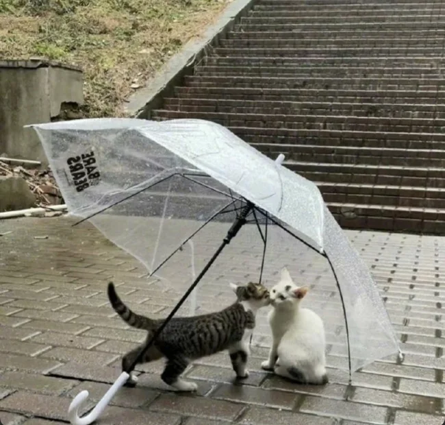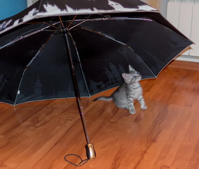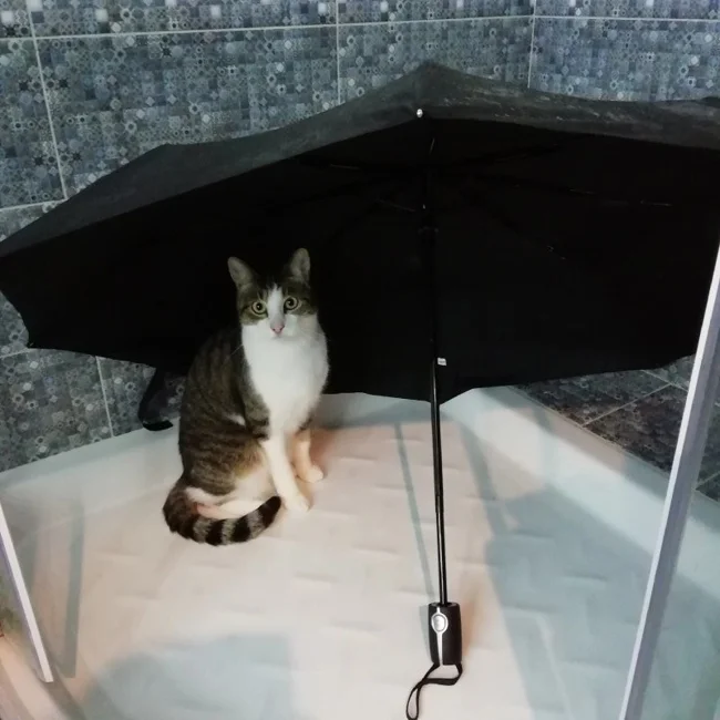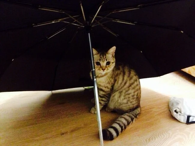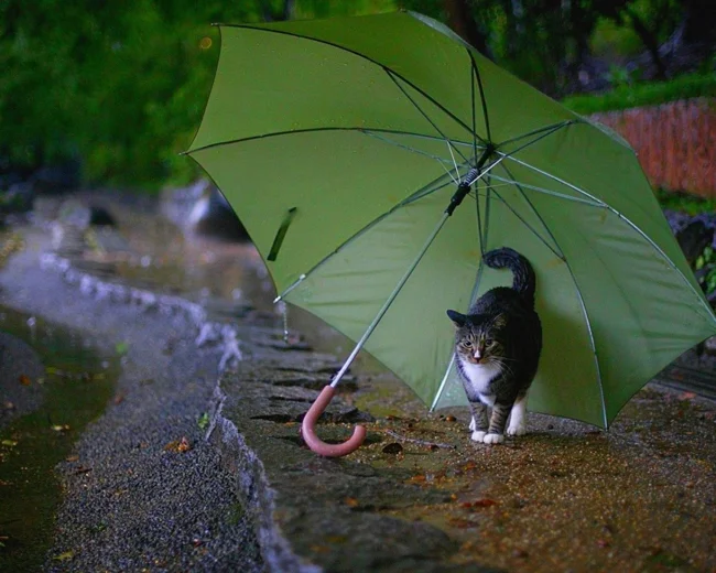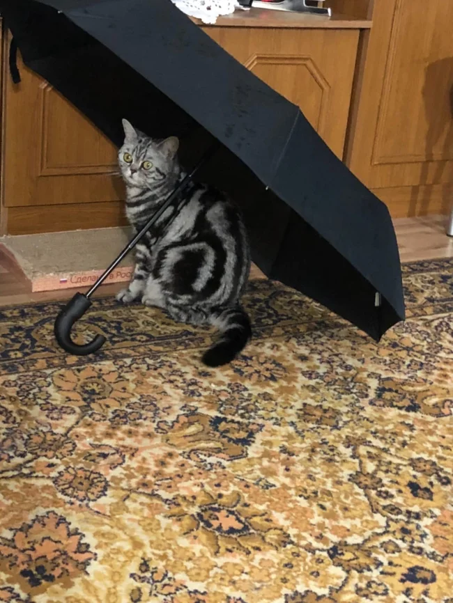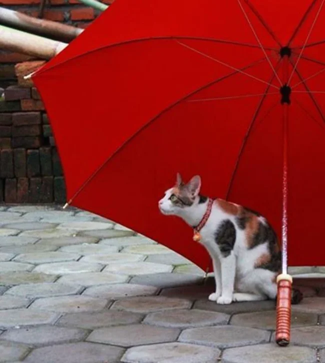 Но когда жидкости становится слишком много, особенно если дождь начинается неожиданно, хочется быстро занырнуть под спасительный, пусть и ограниченный кров. Впрочем, от палящих солнечных лучей зонт тоже спасает. И не только людей, но и котиков, которые умеют позировать под зонтами очень и очень эффектно. И любят это дело даже без всяких там дождиков и ливней.