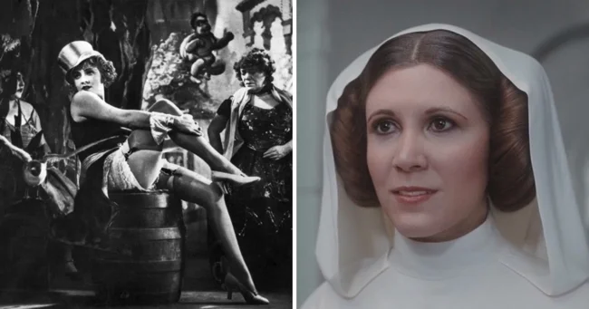 На первом фото — актриса Марлен Дитрих, которая стала символом своей эпохи (кадр из фильма 1930 года «Голубой ангел»). Девушку на втором фото, Кэрри Фишер, также трудно не узнать, её образ принцессы Леи надолго закрепился в культуре.