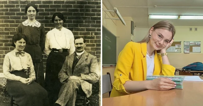 Коллективный портрет учителей одного из городков Новой Зеландии (около 1910 года) и современный учитель.