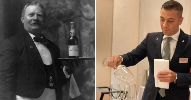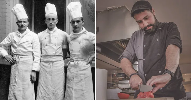 На фотографии 1920 года запечатлён Джо Тюилье (справа) — ирландский шеф-повар. На современной фотографии — шеф-повар греческого ресторана.