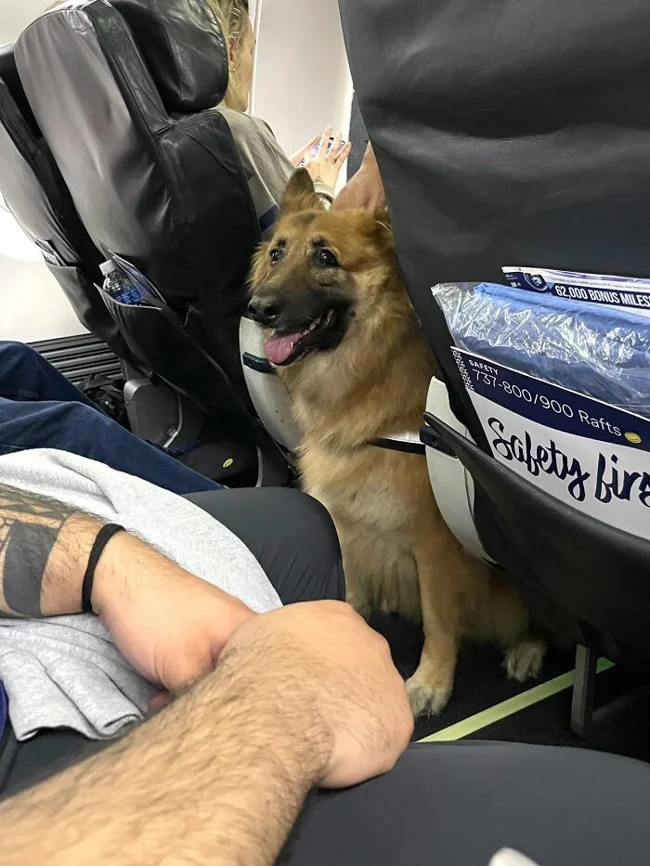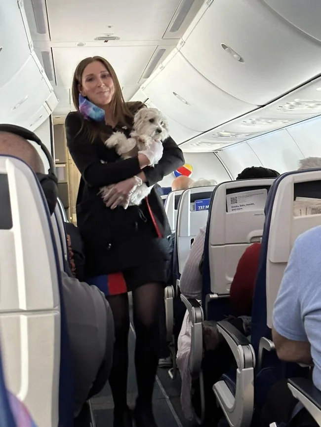 30. Стюардесса "доставляет" хозяевам пёсика, который выбежал в салон самолёта ![]()