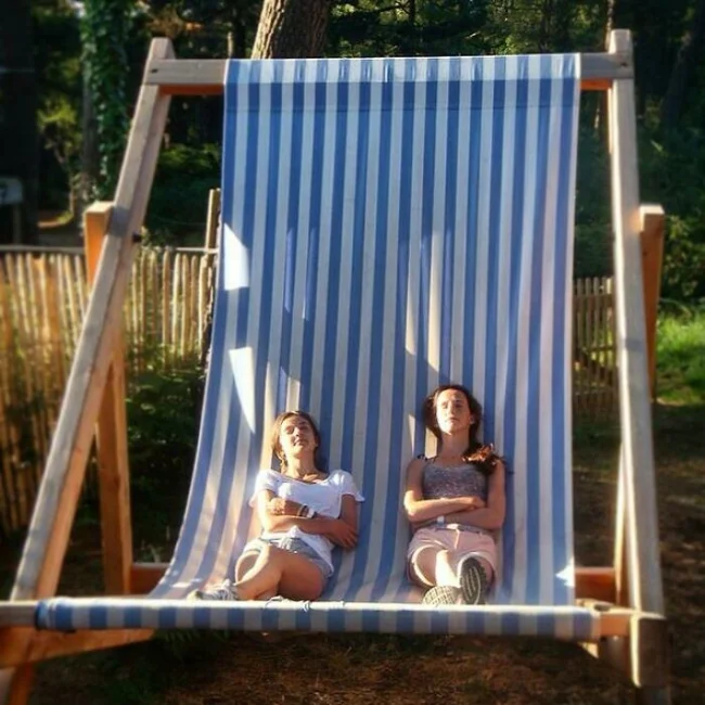 На самом деле, люди самых обычных габаритов, а вот шезлонг не совсем