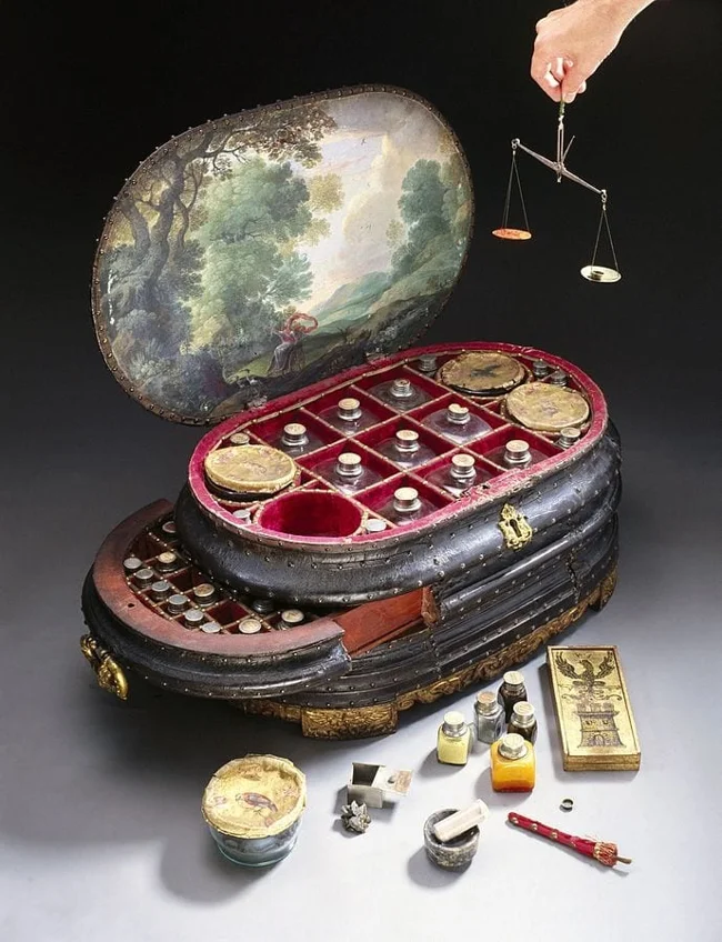 Средневековая аптечка, вмещающая в себя 126 флаконов с лекарствами, 1560-е годы