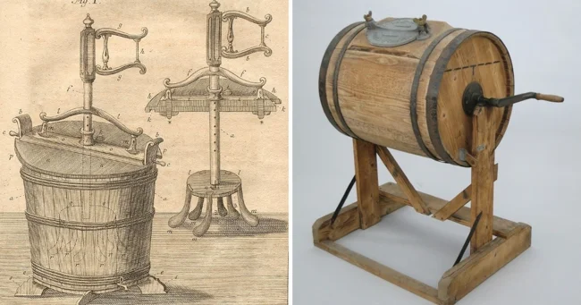 Люди очень давно стали придумывать устройства, которые бы облегчали стирку одежды. Однако первый и наиболее приемлемый вариант разработал Якоб Кристиан Шеффер в 1766 году (его стиральная машина представлена на изображении слева). Чуть позже его идея трансформировалась и её стали брать на вооружение другие изобретатели и компании (пример финской стиральной машинки, выпускавшейся с 1943-1949 годах, представлен на фото справа).