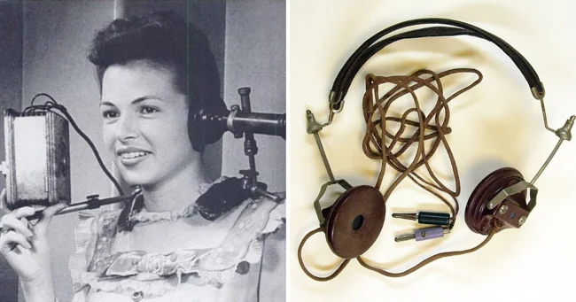 На фото слева представлена первая телефонная гарнитура, придуманная Беллой Эзрой Джиллилэнд. Справа — первые электромагнитные наушники, разработанные Натаниэлем Болдуином.