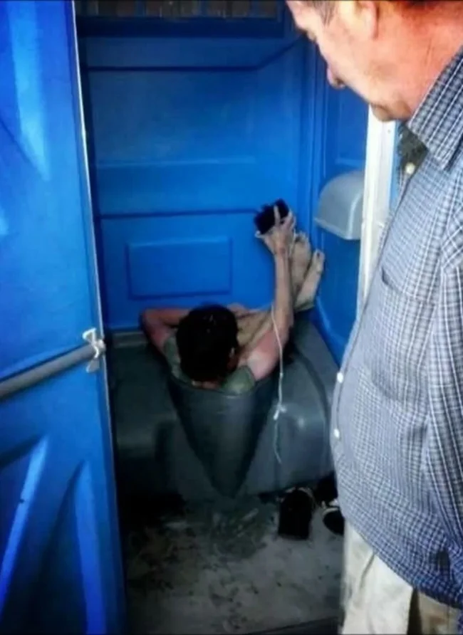 На этой фотографии изображен молодой человек, который застрял в передвижном туалете, расположенном на стройке. Он застрял в таком положении, что из отверстия были видны только его руки, ноги и голова, и он не мог освободиться. Прохожие, услышавшие его крики о помощи, вызвали полицию, которая совместно с охранниками стройки пыталась вытащить его из туалета. После долгих усилий им удалось вызволить юношу из неловкого положения.
