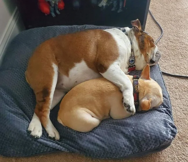 9. "А это мой английский бульдог с синдромом короткой спины, и французский бульдог, которого он обожает"
