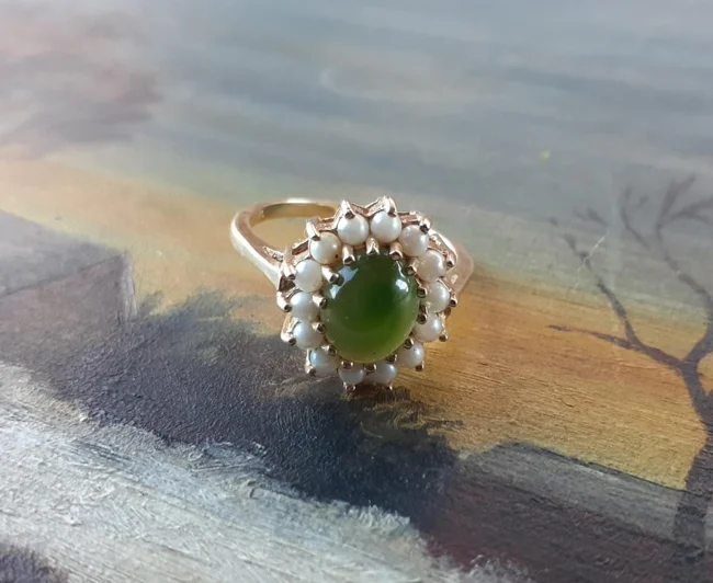 Прошлой ночью нашла это замечательное кольцо из 14-каратного золота с нефритом и культивированным жемчугом
