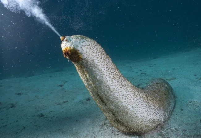 Голотурия - это представитель иглокожих и близкий родственник морских ежей и звёзд. Они на самом деле смахивают на огурец, но при этом на крошечных ножках. На голотурий охотятся все кому не лень - ряд акул, рыбы, крабы, черепахи, люди. Чтобы прекратить эту повальную охоту, они изобрели странный метод защиты: резкое сокращение мышц, а потом выстрел в хищника частью кишечника. Орган этот очень быстро восстанавливается, поэтому они могут им бросаться сколько угодно раз.