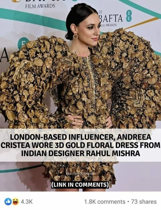 19. «Лондонская инфлюенсер Андреа Кристеа надела золотое платье с 3D-цветами от индийского дизайнера Рауля Мишры»
