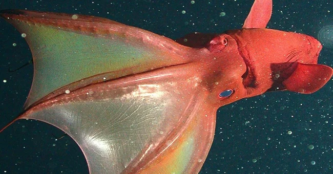 Адский кальмар-вампир или адский вампир (да, так его и зовут) - глубоководный головоногий моллюск, который имеет общие характеристики как с кальмарами, так и с осьминогами. Они живут на глубине от 609 до 914 метров в умеренных и тропических водах Тихого, Атлантического и Индийского океанов. На такой глубине не так просто найти добычу - но вампир приспособился к выживанию. В отличие от своих родственников, они не питаются живыми организмами. Они едят разлагающиеся органические материалы, падаль - в том числе тела ракообразных, фекалии зоопланктона, рыбью чешую, остатки медуз. За это кальмара-вампира называют "утилизатором мусора в океане".