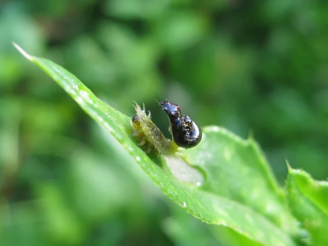 Ещё одна необычная особенность - эти жуки используют свои фекалии, чтобы сделать подобие "зонтика" для защиты от хищников. Такой зонтик - на фото ниже. Личинка даже может менять положение зонтика по мере необходимости, если хищник приближается. Каждый выживает как может!