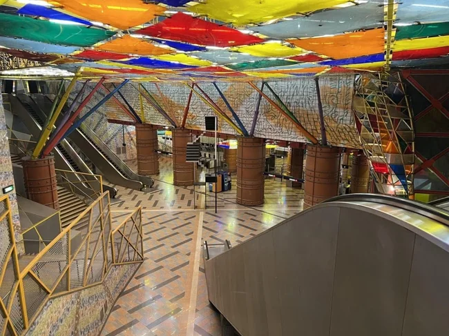 На стенах станции нарисованы изображения с различными сюжетами. Области между картинками состоят из красочных прямоугольников, которые и являются главной фишкой этого архитектурного шедевра.