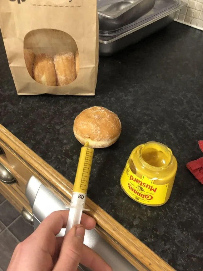 Парень на работе постоянно ел чужие вкусняшки, поэтому коллега решил его проучить и добавил в свои пончики горчицу.