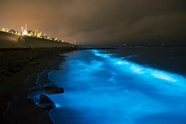 Нет, это не звёздное небо упало в море. Это всего лишь биолюминесцентный планктон — ракушковое ракообразное Vargula hilgendorfii. Именно эти обитатели моря окрашивают воду в светящийся синий цвет. Чаще всего такое чудо можно увидеть в прибрежных водах Японии.
