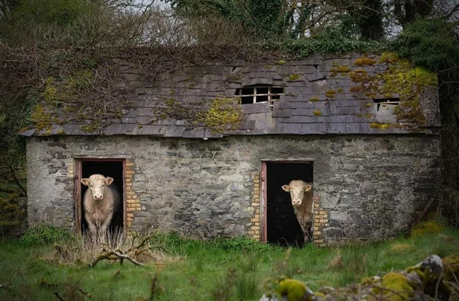 Коровы в заброшенной хижине в Килрикиле, Голуэй, Ирландия