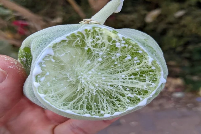 Например, вот это непонятный плод с волокнами внутри называется калотропис высокий. Правда, трогать его в разрезанном виде не стоит, поскольку его молочный сок очень ядовит.