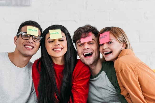 Для игры «Кто я?» потребуются бумажные стикеры. Игроки пишут на нём какую-нибудь реальную личность или героя книги, фильма. Затем стикер наклеивается на лоб соседу. Каждый участник по очереди задаёт вопрос, на который можно отвечать только «да» и «нет». Если на наводящий вопрос получает утвердительный ответ, он продолжает задавать их, пока не отгадает своего персонажа. Если же ответ отрицательный, ход переходит к другому игроку.