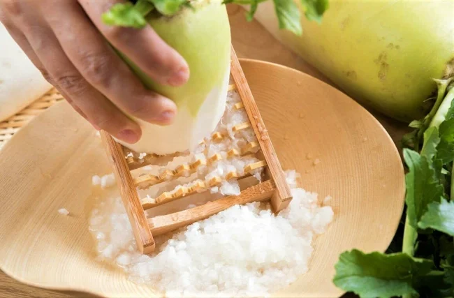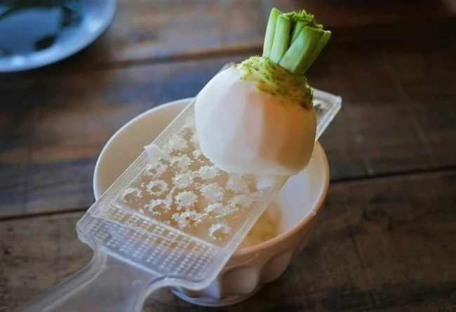 Свежий дайкон трут на терке и подают к жареным и жирным блюдам, к темпуре.