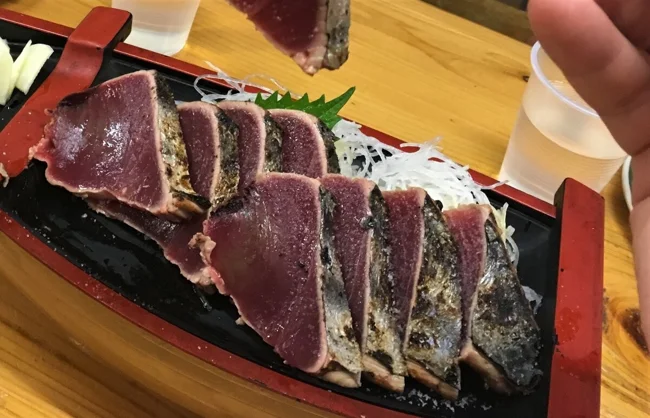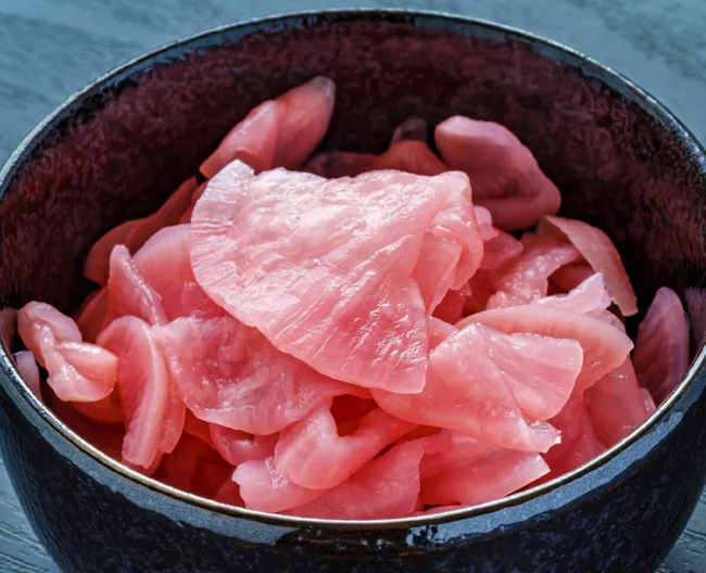 На дайконе, нарезанным тончайшей соломкой, подают свежие кусочки рыбы (sashimi).