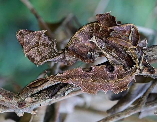 Но самое прекрасное в нашем герое — это его умение копировать листву, в которой он, собственно, и обитает. Всё его тело усыпано шипами, листовыми прожилками и пятнами, а хвост имеет специальные зазубрины, благодаря которым он напоминает подъеденный лист. Картину дополняет и способность менять свою окраску.