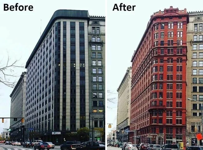 Шофилд Билдинг, ранее известное как Девятая башня Евклида, — 14-этажное здание в центре Кливленда, штат Огайо. Здание модернизировали в 1960-х годах (слева) и восстановили к первоначальному виду в 2016 году (справа).