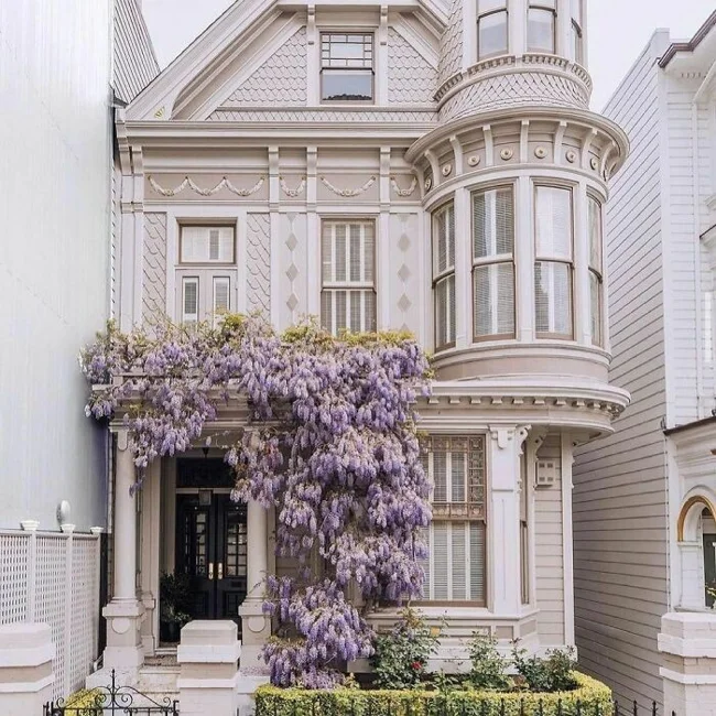 Украшенный цветами глицинии дом в викторианском стиле в Сан-Франциско.