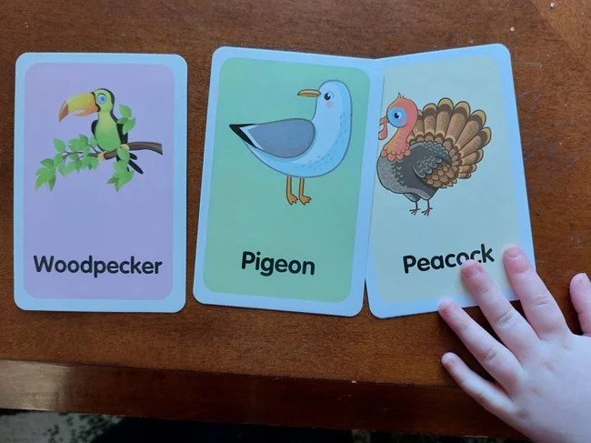 К этим развивающим карточкам для детей явно есть вопросики, ведь на них изображены "Дятел, голубь и павлин".