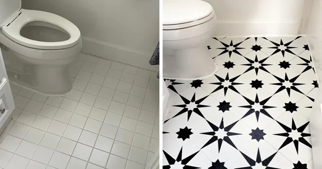 20. "Переехали в новое съемное жилье и просто возненавидели ванную. Решил попробовать самоклеящуюся плитку: мне нравится!"