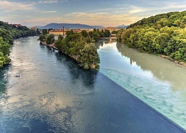 Реки Рона и Аве в Женеве, чьи воды сливаются и имеют разные отложения, и поэтому они разного цвета