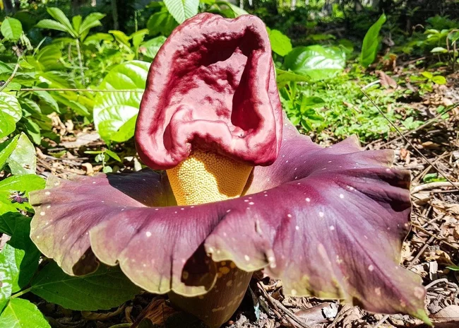 А этот красавец – слоновый ямс, неприятно попахивающий во время цветения. В его клубнях много белка и крахмала.