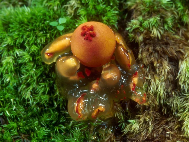 А вот это - несъедобная красноустка с оранжевым или красным телом. Гриб покрыт слизью и ядовит для употребления.