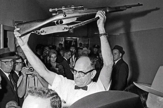 Полицейский Далласа держит карабин Каркано M91/38 калибра 6,5 мм итальянского производства , из которого, по версии следствия, был убит Джон Кеннеди. 1963 год.