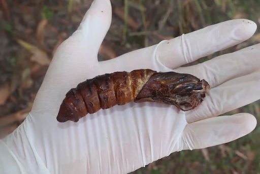 Пока гигантская моль еще гусеничка и обладает мощными челюстями она поедает только эвкалиптовые посадки. Малышка настолько мощная, что буквально превращает кору эвкалиптовых деревьев в труху.