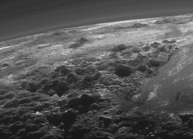 Горы, обнаруженные на Плутоне космическим аппаратом «Новые горизонты», пролетевшим над карликовой планетой в 2015 году. Они покрыты одеялом из метанового льда, создающего яркие отложения, поразительно похожие издали на заснеженные горные цепи Земли.