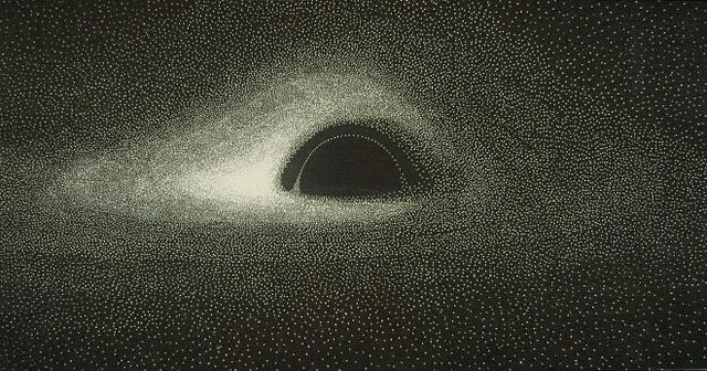 Это изображение, рассчитанное на компьютере IBM 7040 с использованием перфокарт 1960 года и нарисованное вручную французским астрофизиком Жаном-Пьером Люмине в 1978 году.