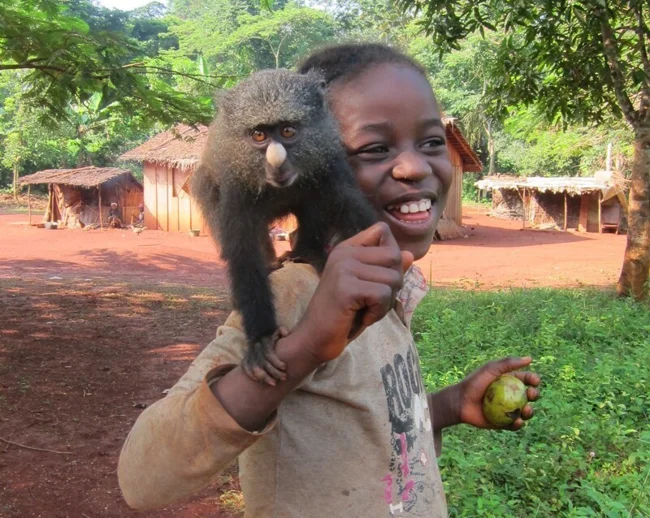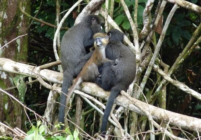 Посередине не ребёнок. Это малая белоносая мартышка. Они часто тусуются вместе с нашими героями и даже способны давать совместное потомство.