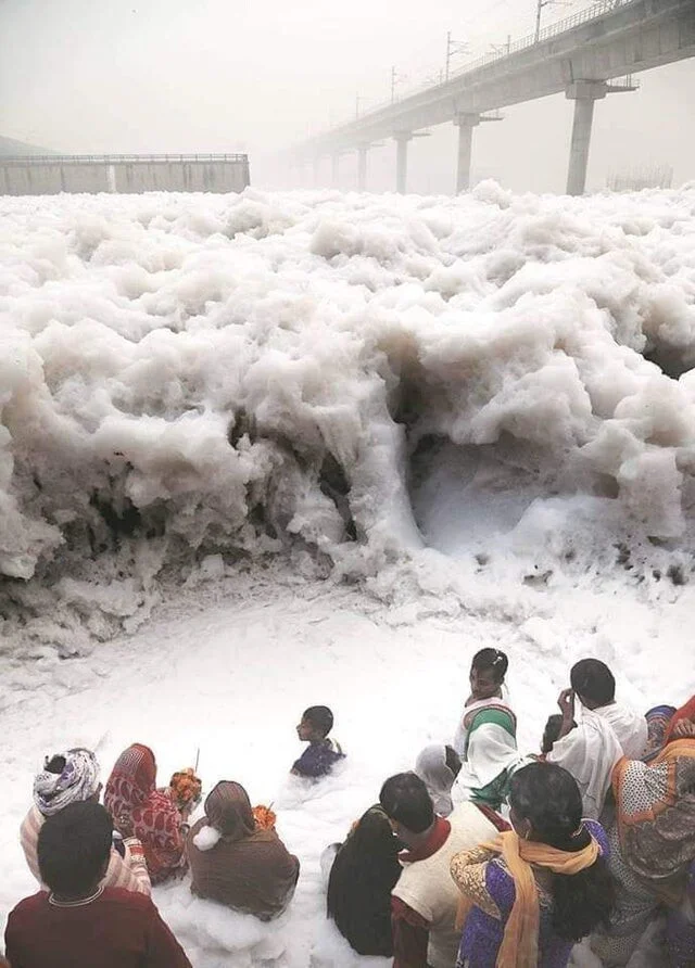 Люди молятся на реке Ямуна, Индия. Река пенится из-за промышленных отходов.