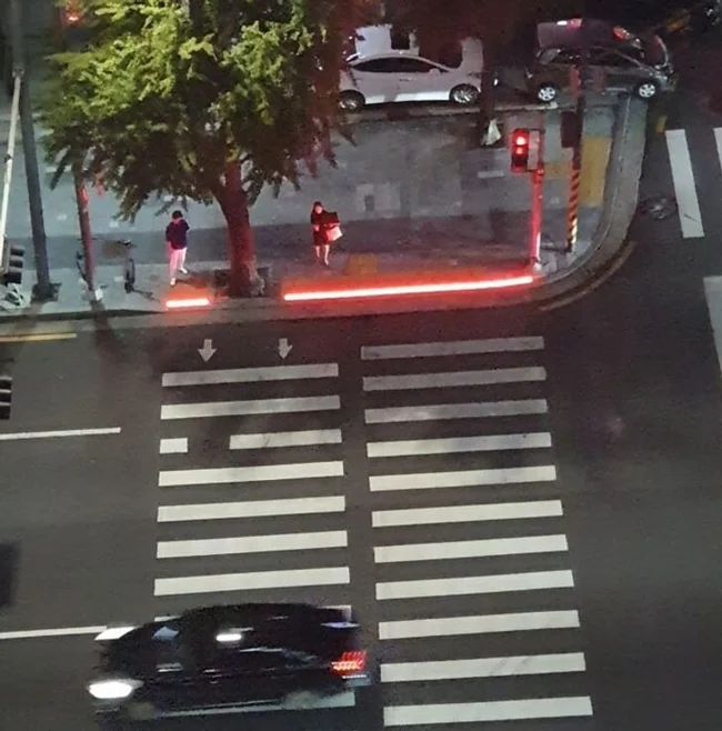 На пешеходных переходах в Корее есть световые полосы на тротуаре