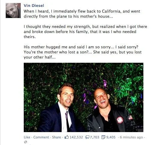 У него очень своеобразный рекорд. Посе того, как погиб его друг и коллега по фильмам серии "Форсаж", Пол Уокер, Дизель разместил в соцсети пост. Он собрал больше 8 млн лайков. Вот таким вот странным и парадоксальным образом он увековечил память о своем друге. Ставить лайки в таком случае - это странно, однако, конечно же, это не значит, что людям понравилось то, что случилось. Таким образом они выразили свою поддержку и сочувствие.