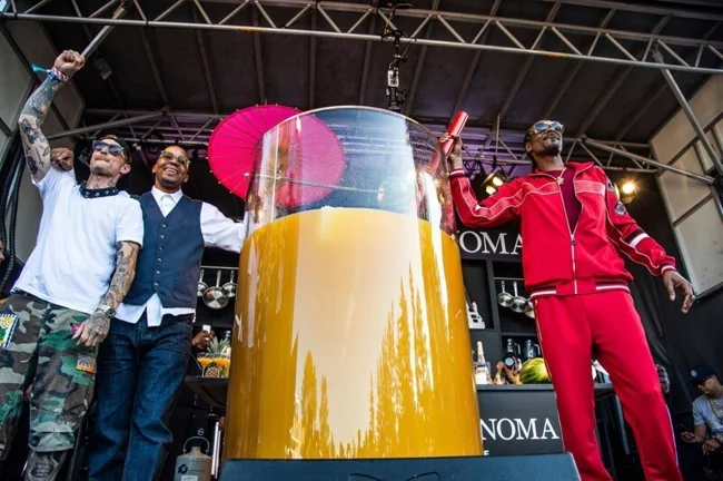Он приготовил коктейль Paradise, для чего ему понадобилось 315 литров джина, 156 литров абрикосового бренди и почти 106 литров апельсинового сока. Всю эту красоту Снуп дополнил гигантской трубочкой, розовым зонтиков и арбузом, нанизанным на меч.