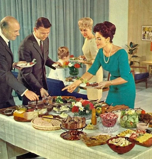 Затем следовало горячее – печеный картофель и мясные блюда типа котлет и фрикаделек. Угощение подавали на стол в огромных мисках, и каждый брал себе еду на свой вкус. Такой способ подачи позволял и быстро накормить оголодавших путешественников, и не мешал общению. На шведском трапеза носила название smörgåsbord, от bord (стол) и smörgås (бутерброд).