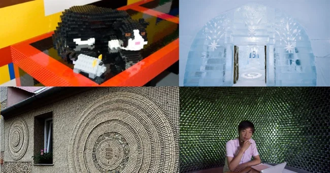 Здания из бутылок, пробок, лего и даже мусора.